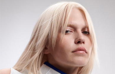Präzises Färben mit einem monochrom sandfarbenen Toner akzentuiert die Linien und Konturen des Cuts und verleiht dem blondierten Haar Glanz.